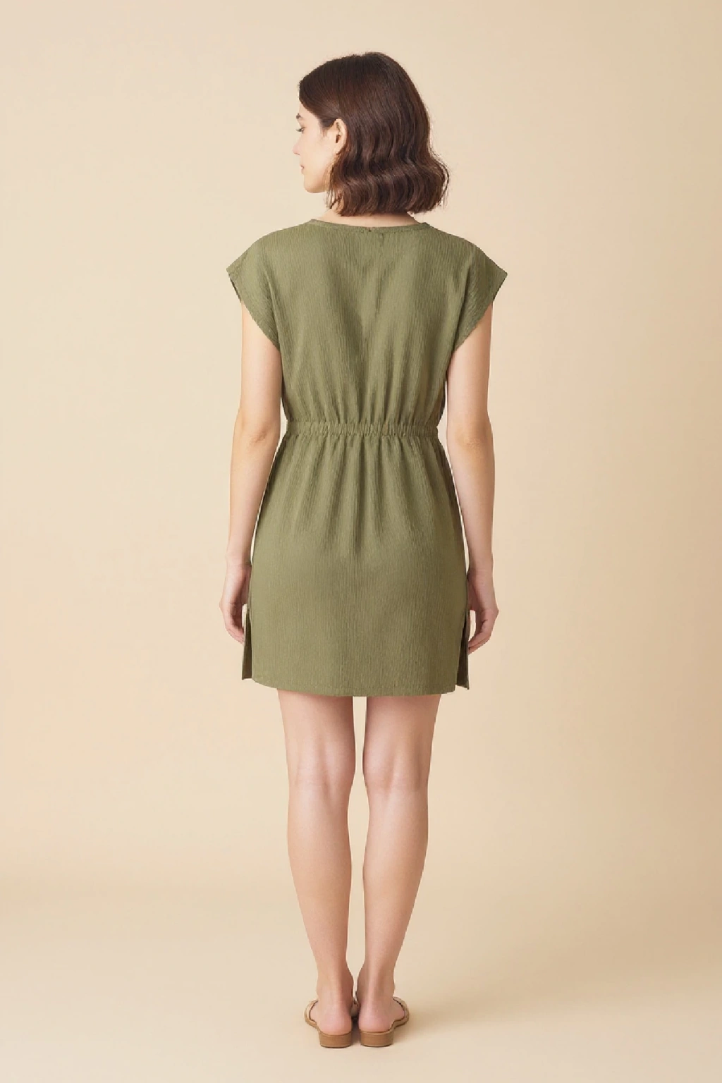 Haki tonunun doğallığıyla yazın enerjisini yansıtan bu elbise, her vücut tipine uyum sağlayan rahat kesimiyle dolabınızın favorisi olacak.