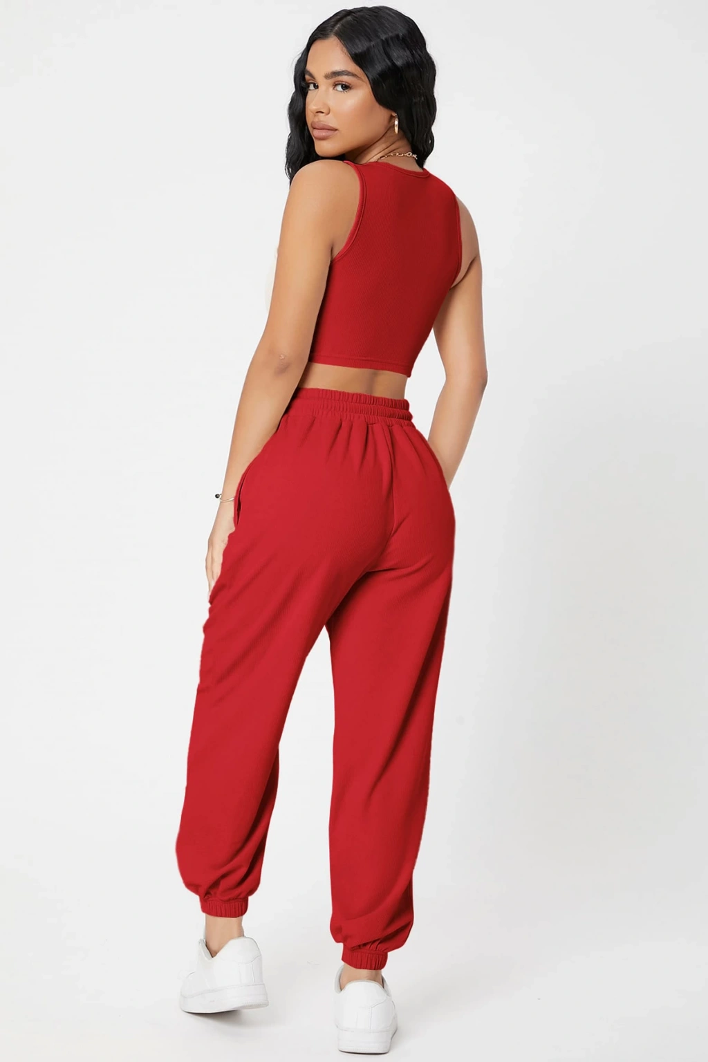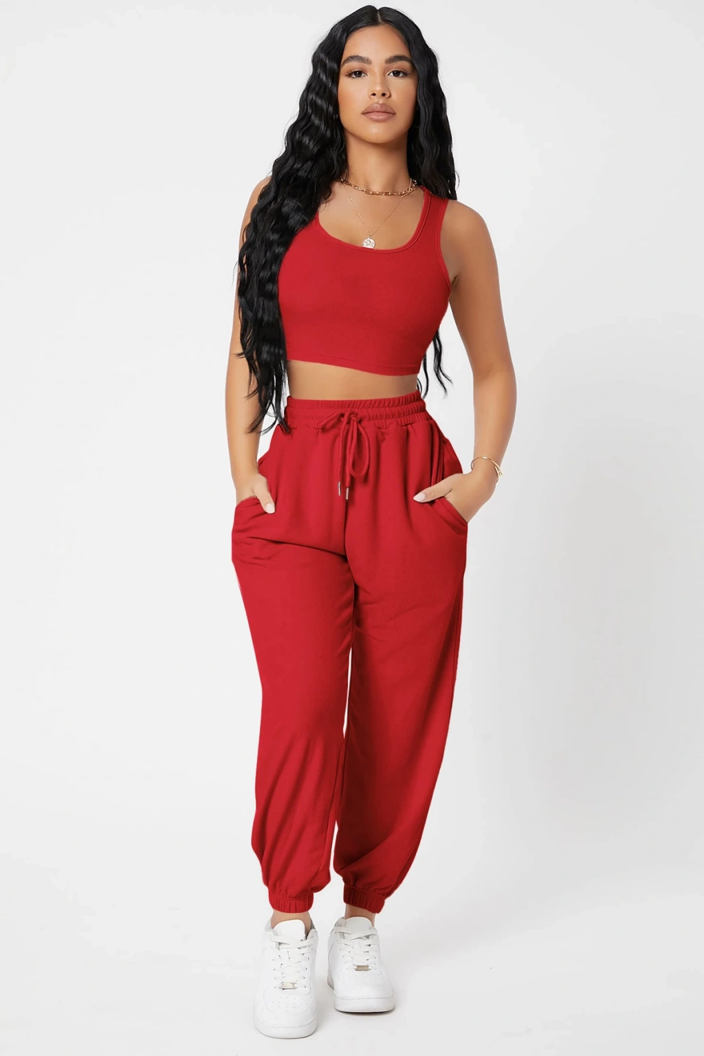 Kadın Kırmızı Kaşkorse Cepli Jogger Eşofman Altı ve Crop Top Bluz