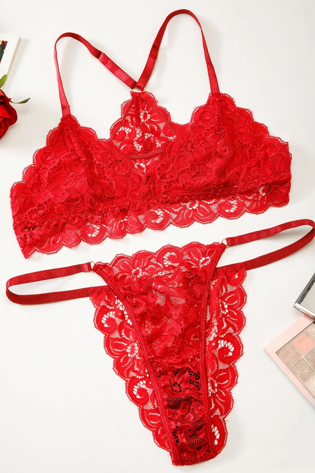 Kadın Kırmızı Sırtı Dantel ve İp Detaylı Şık Sütyen Külot Takımı
