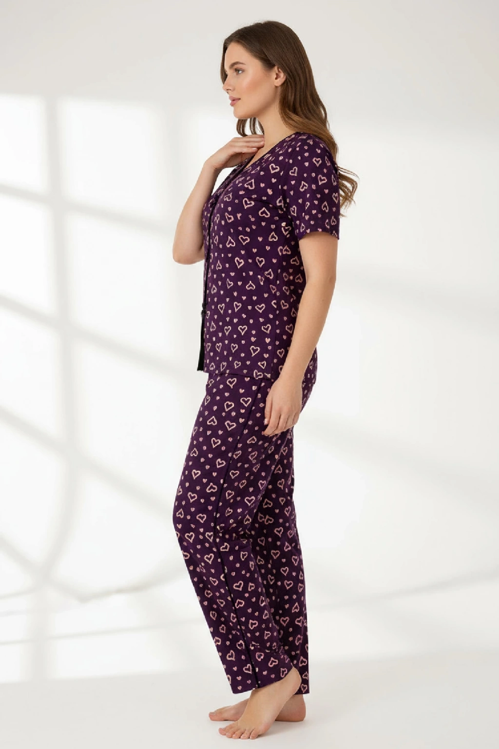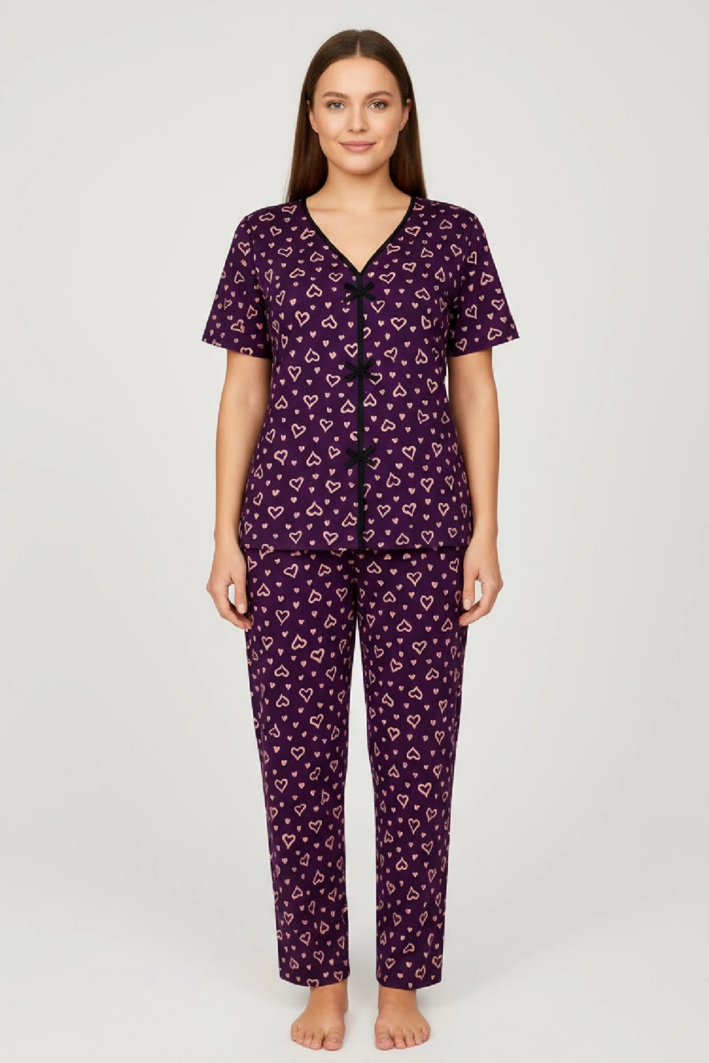 Kadın Mor Kalp Desenli Fiyonklu Kısa Kollu Uzun Pijama Takımı